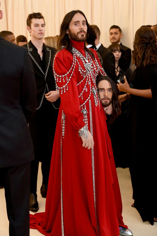 Jared Leto in Gucci.He carries his head as an accessory which completes his look like out of the box !!