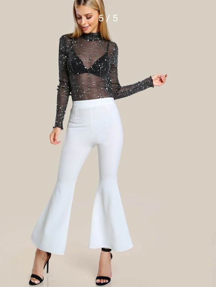 Colour – Black ; Details – Contrast sequin, sheer, lettuce trim ; Fabric – Fabric is very stretchy ; Fit type – Slim fit ; Length – Regular length ; Composition – 95% Nylon, 5% spandex ; Neckline – stand collar ; Pattern type – Galaxy ; Season – All seasons ; Sleeve length – long sleeve ; Sleeve type – Regular sleeve ; Style – glamorous, sexy.